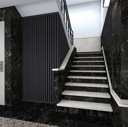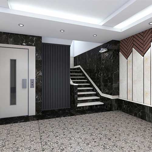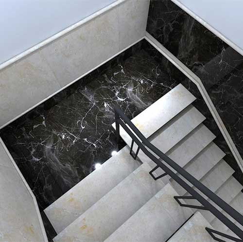 استفاده از سنگ مرمریت جوشقان در کنار سنگ های تیره تر به عنوان مکمل ، ترکیب بسیار زیبا و چشم نوازی خلق میکند که شکوه و جلوه خاصی به فضا و ساختمان می بخشد.